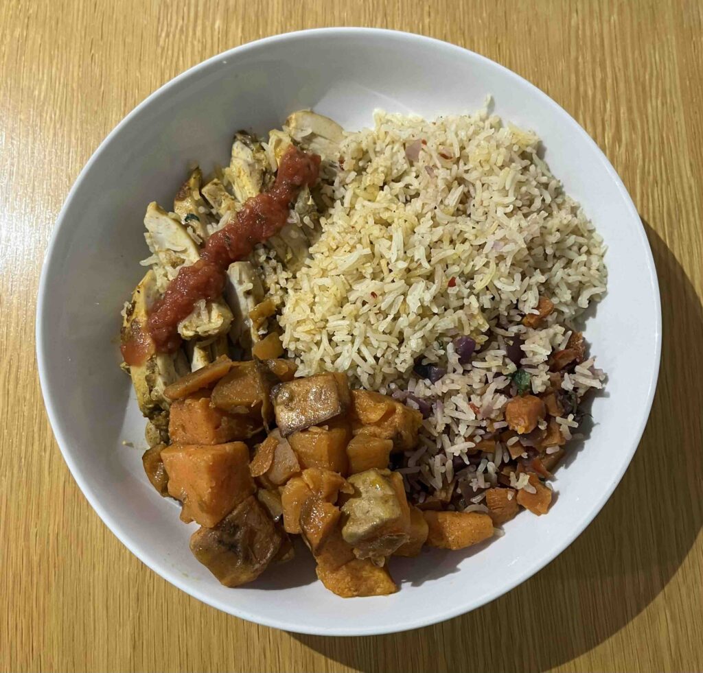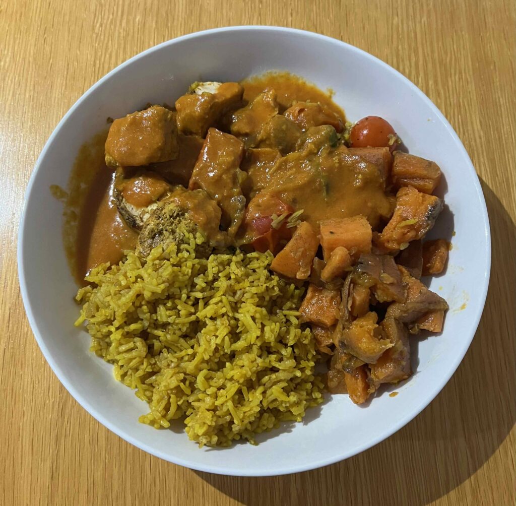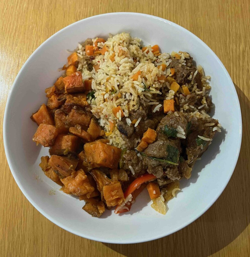 It was quite spicy for me (I am a light weight when it comes to spice) but tolerable with a glass and a half of water. If I had it again I would have with a glass of oat milk, with additional rice and naan bread, as it got spicier the more I ate. There was enough meat for 2 people, but not enough rice to balance it out in my opinion. The additional sweet potato side helped to balance it out.