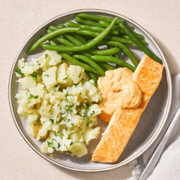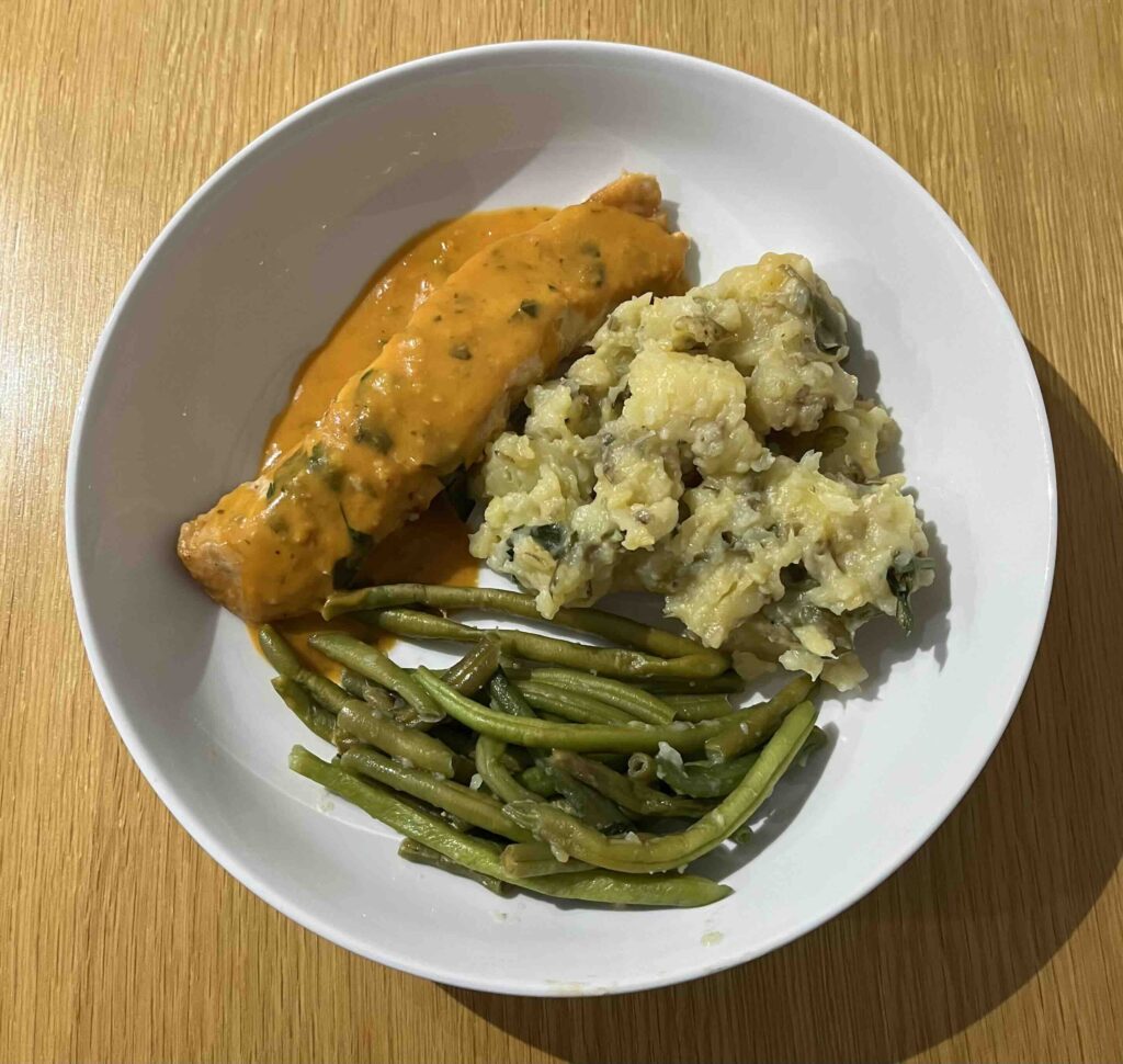 It had a nice aroma. The salmon was a very large meat portion in my opinion. The salmon was beautifully cooked and I would’ve given compliments to the chef if it was in a restaurant. The crushed potatoes with herbs were tasty and an interesting concept. The sauce was nice and creamy and not spicy at all which I liked. The green beans were lovely and soft and went well meal.
