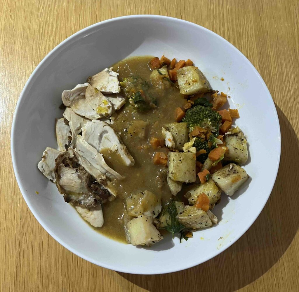 I initially had to cut some of the turkey off as part of it was sealed to the packet. Some of the turkey had fat on it which I didn’t like. Some of it was quite dry and needed moisturising with the gravy. Surprisingly, there was a slight kick (spice) to the gravy which is very odd because traditionally gravy does not have any spice in it (which I prefer) and I don’t believe it described the meal as having spice in it. Overall it felt more like a lightly spiced curry rather than a roast. The carrots were not cooked enough and were crunchy. They were also smaller than pictured on the website. The potato cubes were okay, but sweet potato cubes would’ve been better for a more varied flavour profile.